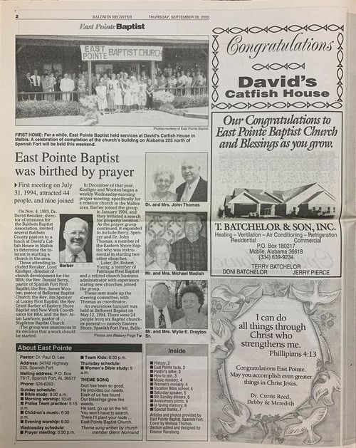 The Holy Spirit worked in people's hearts and East Pointe Baptist Church was formed as a direct result of the prayers of God's people. Eastern Shore Baptist Church was approved by the North American Mission Board to be the mother church. A steering committee was formed and weekly meetings began once a place of worship was found.